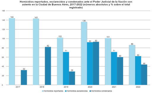 Fuente: elaboración propia a partir de datos del Instituto de Investigaciones de Homicidios del Consejo de la Magistratura de la Nación, el Ministerio de Justicia y Seguridad de la Ciudad de Buenos Aires, el Registro Nacional de Reincidencia (RNR) y el Instituto Nacional de Estadística y Censos (INDEC) (tasas cada 100.000 habitantes).